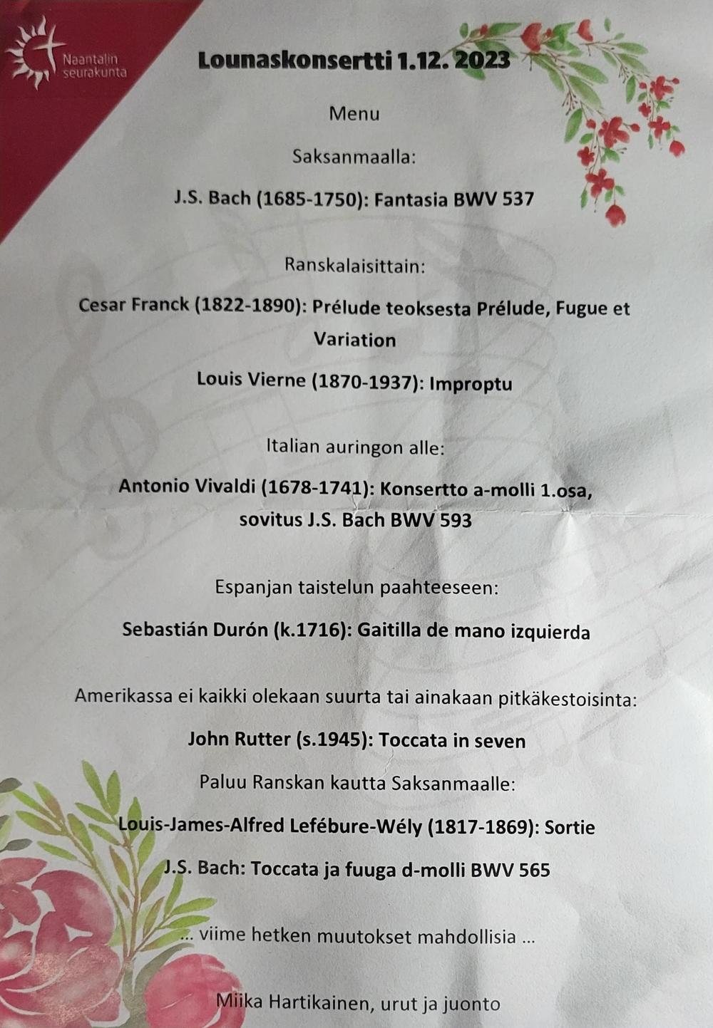 Joulukuun 2023 musiikkiklubi pidettiin perjantaina 1.12. klo 11 Naantalin kirkossa.